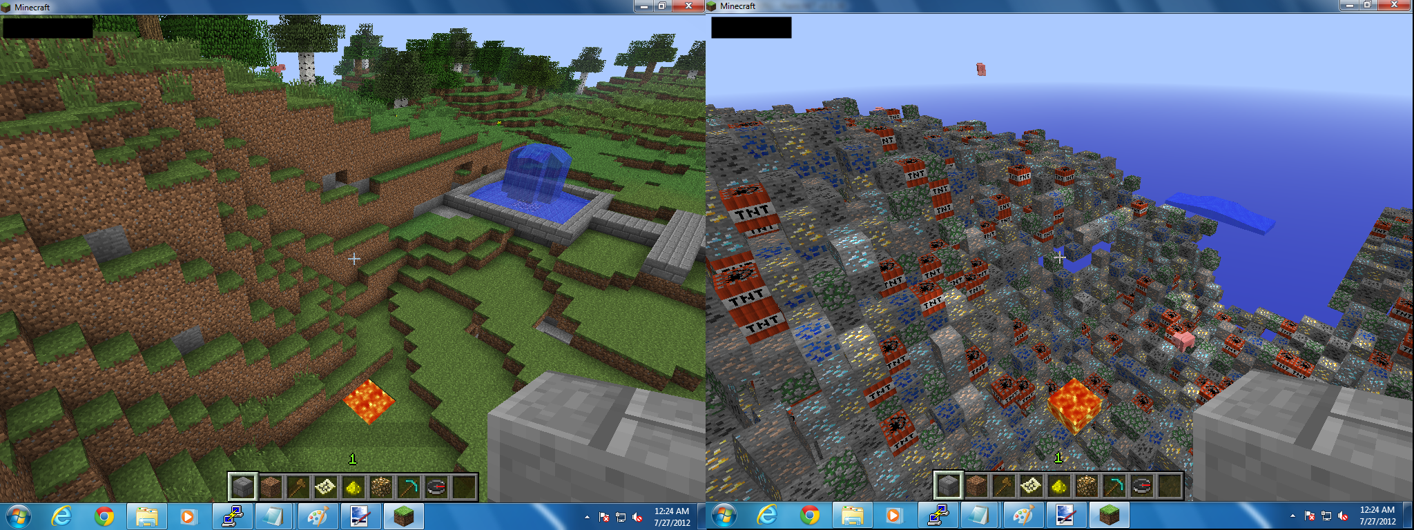 Also, xray is... interesting now. (Click on the image to make it bigger) 4:39 PM 7/23/2012 Here is the old world's save file: ninja.zip 12:07 PM 7/5/2012 The server is up! It is at bigdaddy.no-ip.org:25566 with a whitelist It is at Calon's house and has a new map! It is survival only right now but I'm thinking about setting up a creative world for testing creations. 4:25 PM 5/30/2012 The server is being set up again, hopefully this time it will be more stable. It will be moving to Calon's house next weekend hopefully. It was never at Brayden's. Anyway, I will be able to upgrade the server without having to go to his house now, so updates should be more fluid. And Calon won't be able to cheat . We will be resetting the map, and ther revere will be running the current version of Minecraft, 1.2.5 11:32 AM 5/8/2012 The server hasn't been up for several weeks now. John's dad is sick of the printer not working, so he just leaves it off If I ever have time on a Saturday to move it I will, but that may not be in the near future. Sorry. Blame John's Dad. 6:40 PM 4/24/2012 The server will be moving to Brayden's house this saturday. I still don't know if this is a good thing or a bad thing. All I know is that at 10:00 every night the server will be shut down. So, basically, I'm going to stop playing Minecraft. Hooray! 7:31 PM 4/10/2012 There is a bug with the login plugin on the server. I will update it asap. This is the "You Are Already Logged In" bug. It will be fixes as soon as I can get to John's house The first person to text me about this message will recieve a diamond. 11:59 AM 4/10/2012 Attention: Somewhere on the site is a hidden code. if someone can find it and give it to me in the next 24 hours they get 2 diamonds. 4:28 PM 4/8/2012 Please remember to /logout when you are done playing! Failure to do so will make it so when you try and log in it will say "You are already logged in!" We have to restart the server to fix this, so /logout OR ELSE. 5:44 PM 4/2/2012 Big Daddy has been updated to 1.2.4. You will need to go to "Latest Version of Minecraft" and download the auto updater. Also, when you log in you will be required to register a password. This is so that other people can't log into your account. 7:15 PM 4/1/2012 Big Daddy has a website! Come here if you get "Outdated Client" when you try and connect to the server. This will likely happen sometime this week, I'm going to update the server. |